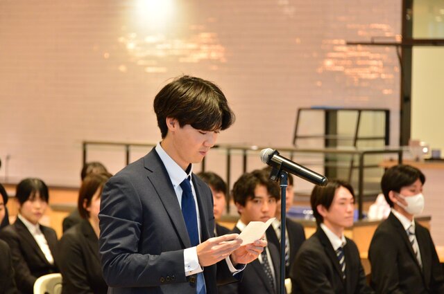 入社式では、まだまだ緊張している様子の新卒社員たち。