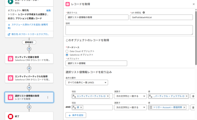 この2つの情報をフロー上で取得し、PicklistValueInfoで取得したい選択リスト値の情報を特定することができます。