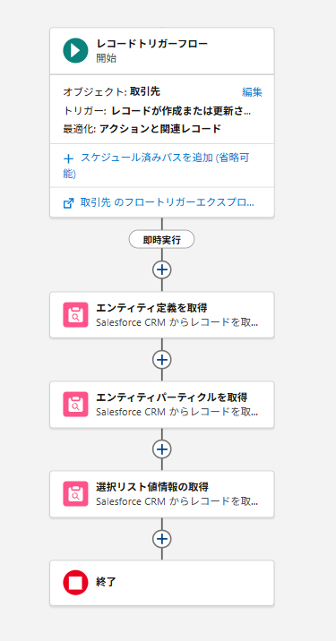 今回は取引先にある選択リスト値の表示ラベルの情報を取得する想定で行うため、以下の設定で取引先に関する情報を取得します。