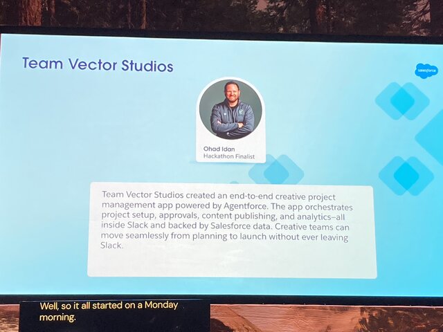 次に登場したのは、たった一人でチームを組んだOhad Idanさん率いる「Team Vector Studios」 。彼が披露したのは、映画のローンチプロジェクトの企画から承認、ウェブサイトへの公開まで、すべてのプロセスをSlackとAgentforceで管理するソリューションです。