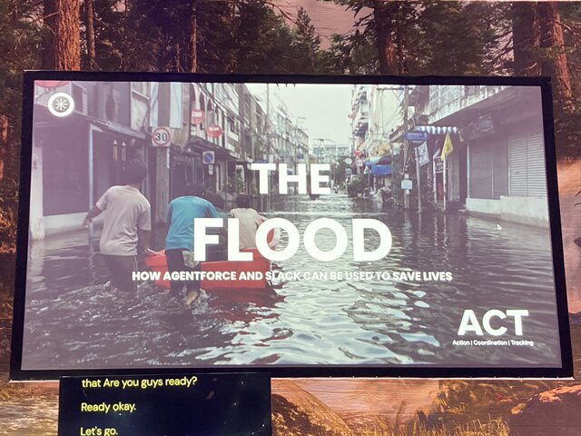 デモでは、現場にいる人がSlackに「洪水が発生した」と音声メモを投稿するシーンから始まりました 。するとAgentforceがその内容を即座に要約し、Salesforceに構造化されたケースとして自動で作成を行います。さらに、関係者間の連携を促すためのSlackチャンネルとCanvasまで自動生成されました。