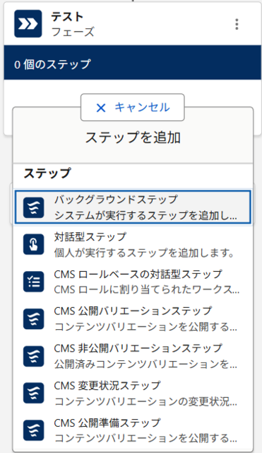 続いて、フェーズ要素を作成します。今回は、選考段階ごとにフェーズを分けて作成するため、「一次選考」という名称でフェーズを作成します。フェーズをクリックすると、「ステップを追加」というボタンが出るため、このボタンを押下します。すると、ステップの種別を選択する必要がありますが、今回は画面フローを使用するため、「対話型ステップ」を選択します。