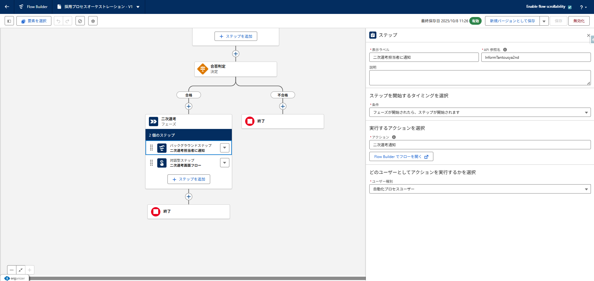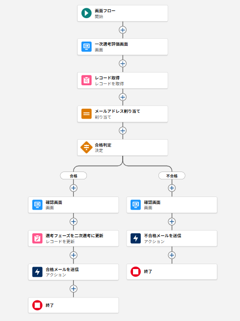 フローオーケストレーションはフローを組み合わせて作成するため、作成する前にプロセス全体を整理し、どのようなフローが必要かを判断してから作成することが重要です、今回は、一次選考の画面フロー(応募者へのメールまで行う)、二次選考の画面フロー、二次選考担当者へのカスタム通知フローの3つを作成します。フローのキャプチャは添付しますが、詳細な内容は割愛します。
