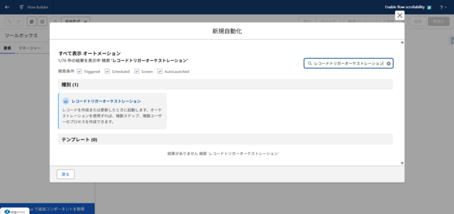 FlowBuilderの画面で「レコードトリガ―オーケストレーション」と検索すると、以下のようにヒットすると思いますので、選択します。
