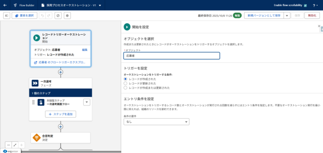 今回は応募者レコードが作成された際に動作し、一次面接の担当者に一次面接の画面フローを割り当てるため、フローオーケストレーションの開始条件は以下のように設定します。