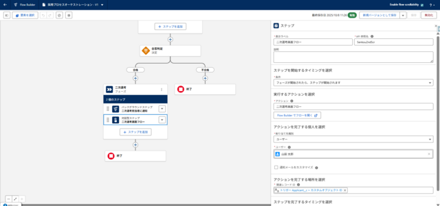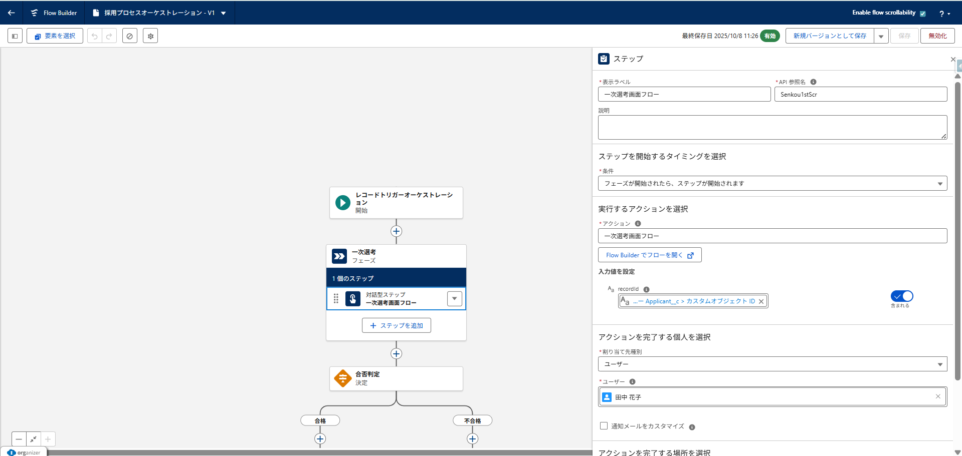 実行するアクションは、作成した「一次選考画面フロー」を選択します。アクションを完了する個人を選択で、どのユーザー、またはキューに画面フローを割り当てるかを選択することができます。今回は、「田中 花子」というユーザーを選択します。