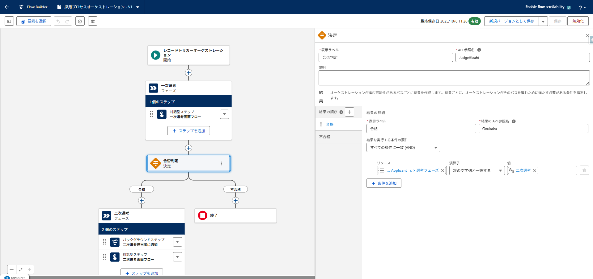 決定要素は、フローと全く同じ使い方で利用可能です。今回は、画面フローから情報を受け取り、応募者が一次面接合格か否かで分岐させます。