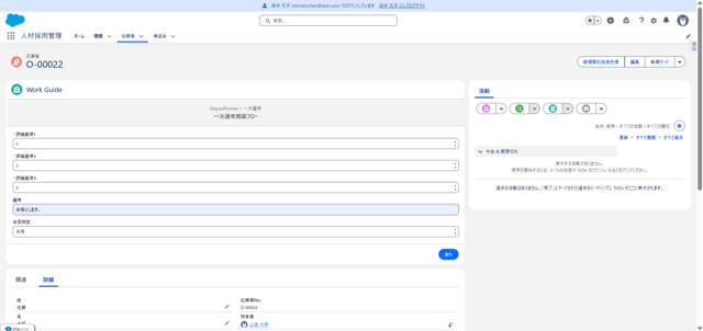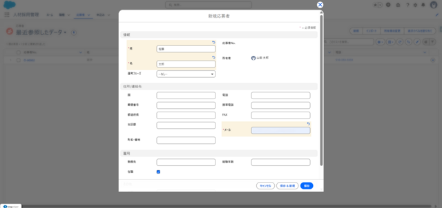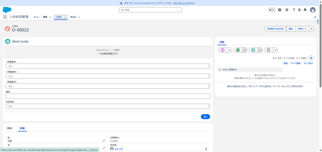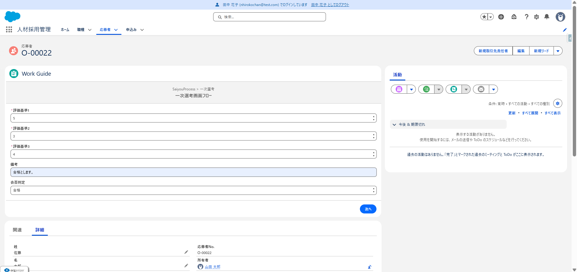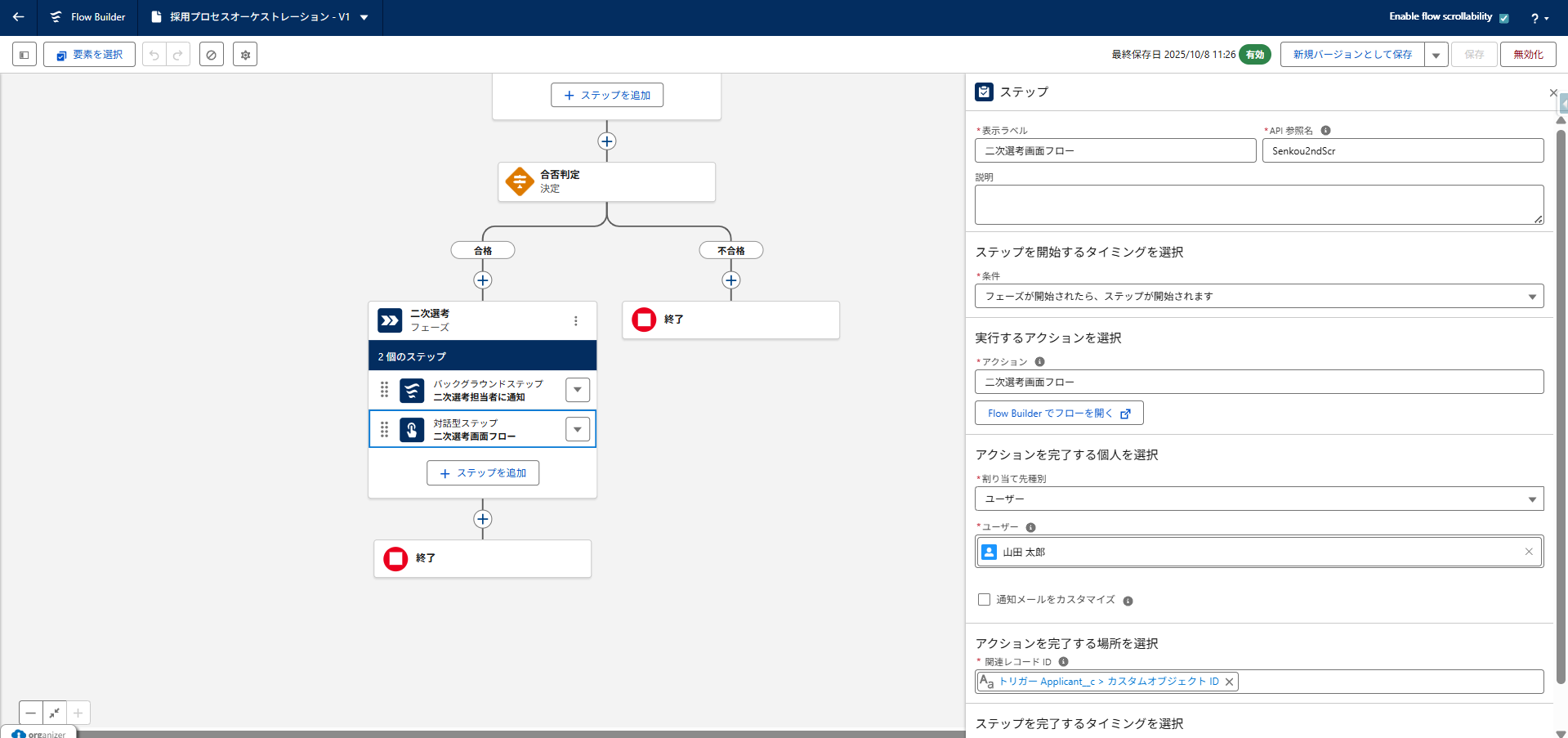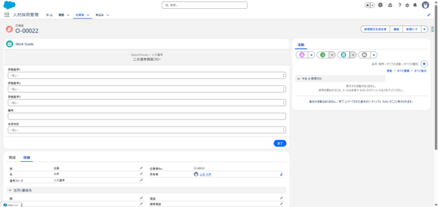 そして、山田 太郎のアカウントでレコード画面に遷移すると、二次選考画面フローが表示されました。