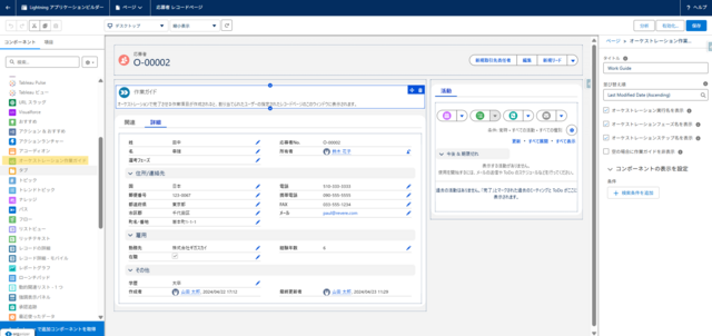 フローオーケストレーションを使用する際には、フローオーケストレーションの中で使用する画面フローを表示させるための「オーケストレーション作業コンポーネント」というコンポーネントをレコード画面に配置する必要があります。フローオーケストレーションで画面フローが割り当てられた場合、割り当てられたユーザーにのみこのコンポーネントに画面フローが表示されるようになります。