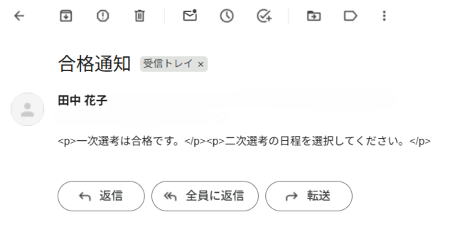 また、メール送信のアクションにより、応募者のメールアドレスには以上のようなメールが届きました。