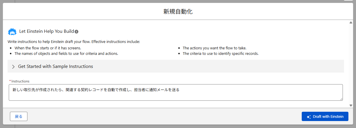 指示文に「新しい取引先が作成されたら、関連する契約レコードを自動で作成し、担当者に通知メールを送る」と入力し、「Draft with Einstein」を押下します。