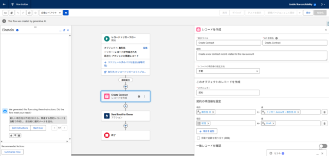 自然言語で作成したいフローの要件を入力すると、Einsteinがフローの構成案を自動で作成してくれます。以前までは英語のみでしたが、日本語でも自動生成が可能になりました。
