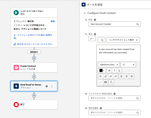 この機能を利用して、取引先レコード作成を開始条件とした簡単なレコードトリガーフローを生成してみます。