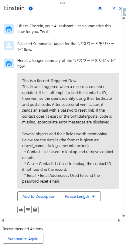 作成されたフローの内容をEinsteinが分析し、説明文を自動生成してくれます。