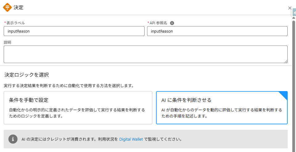「AIに条件を判断させる」を選択すると決定についての説明が現れ、「決定事項」欄が表示されます。この中に、どのような条件で決定を行うかの指示文を入力します。