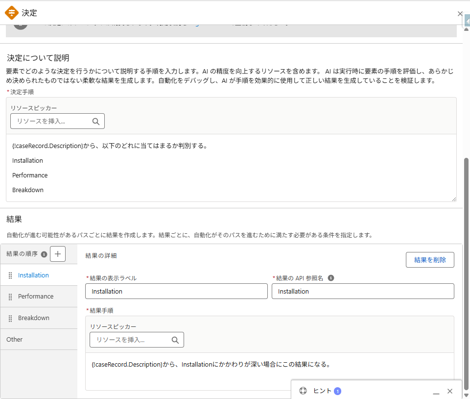 今回は、ケースの「説明」項目に記載の内容から、「原因」項目の値を選択する条件をAIに判断させてみます。「説明」項目はロングテキストエリアのため、従来なら「○○という語句が入っている場合~…」などの判断を指定する必要があります。