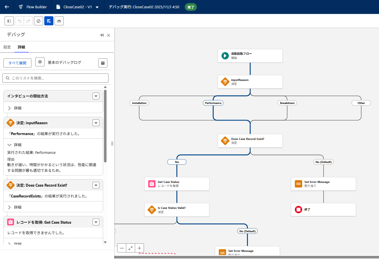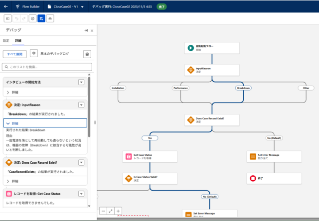 今度は「説明」項目を「一度電源を落としてから再度始動させたが、直らない。」という内容でデバック実行しました。