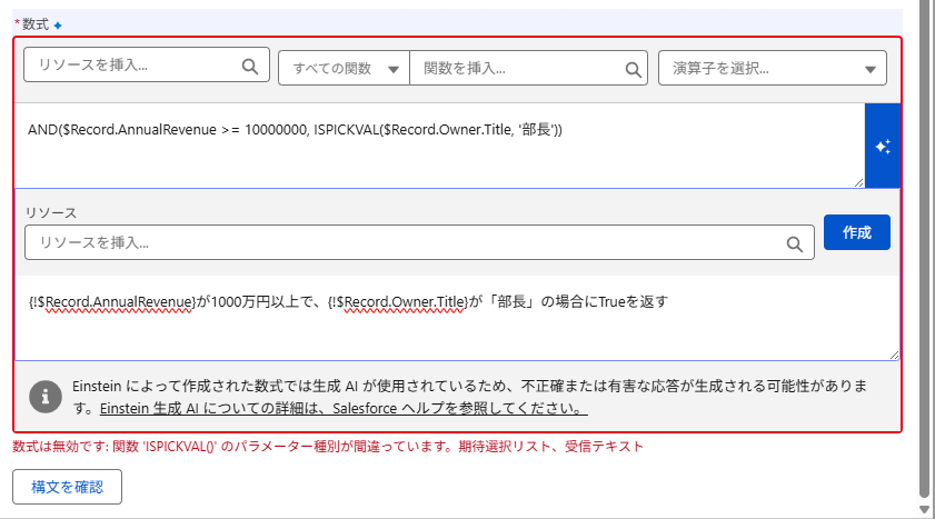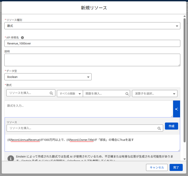複雑な数式を自分で書く代わりに、自然言語で意図を伝えるだけでEinsteinが自動生成してくれます。この機能は数式リソース内の数式と、開始条件の「数式の評価がTrueになる」にて使用される数式にて使用できます。