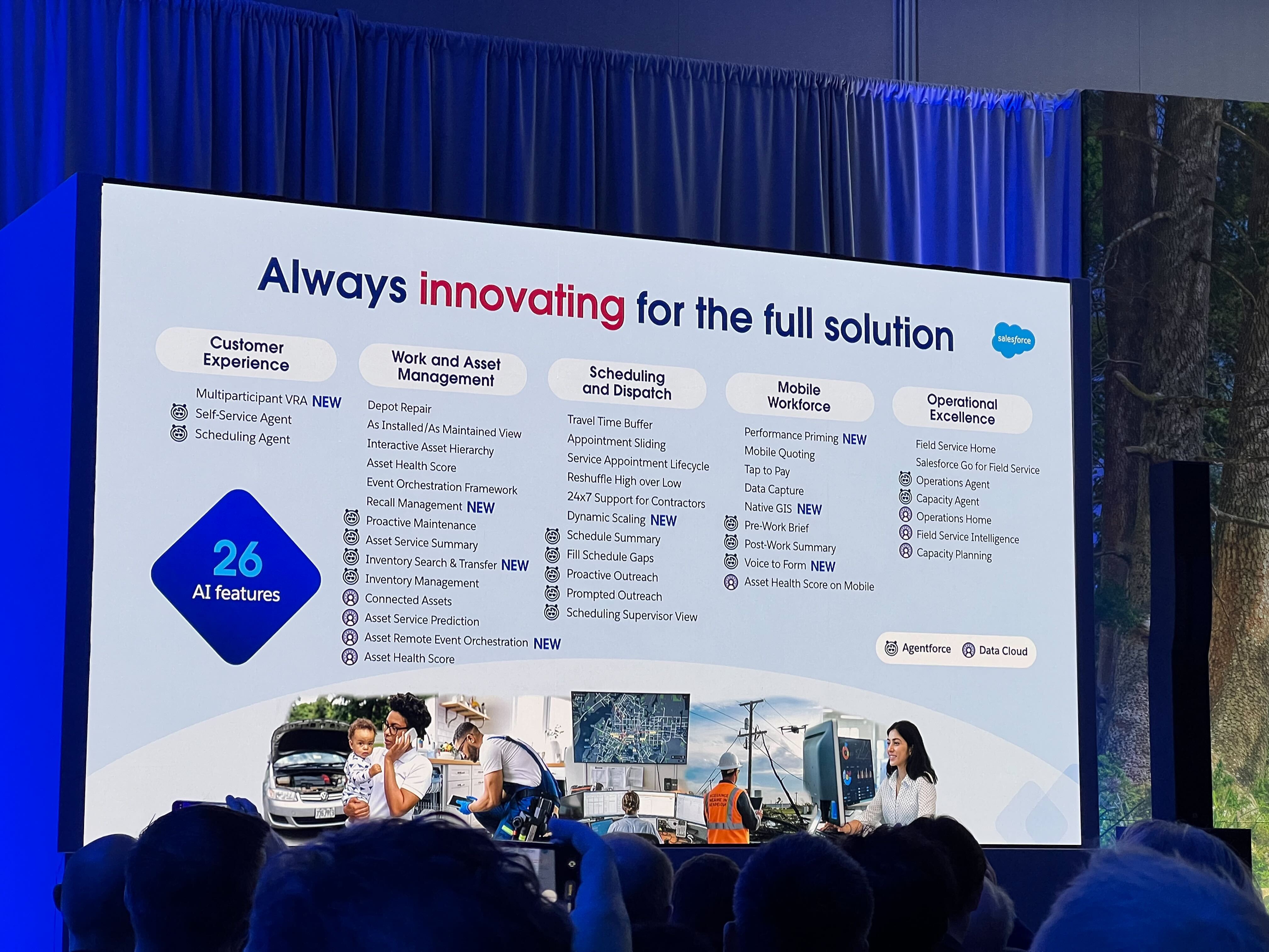 本セッションは『Salesforce Field Service』で従来自動化できていなかった部分をAIを活用して、より効率的なサービスの提供を実現した事例、また新たに提供される機能をテーマとしていました。