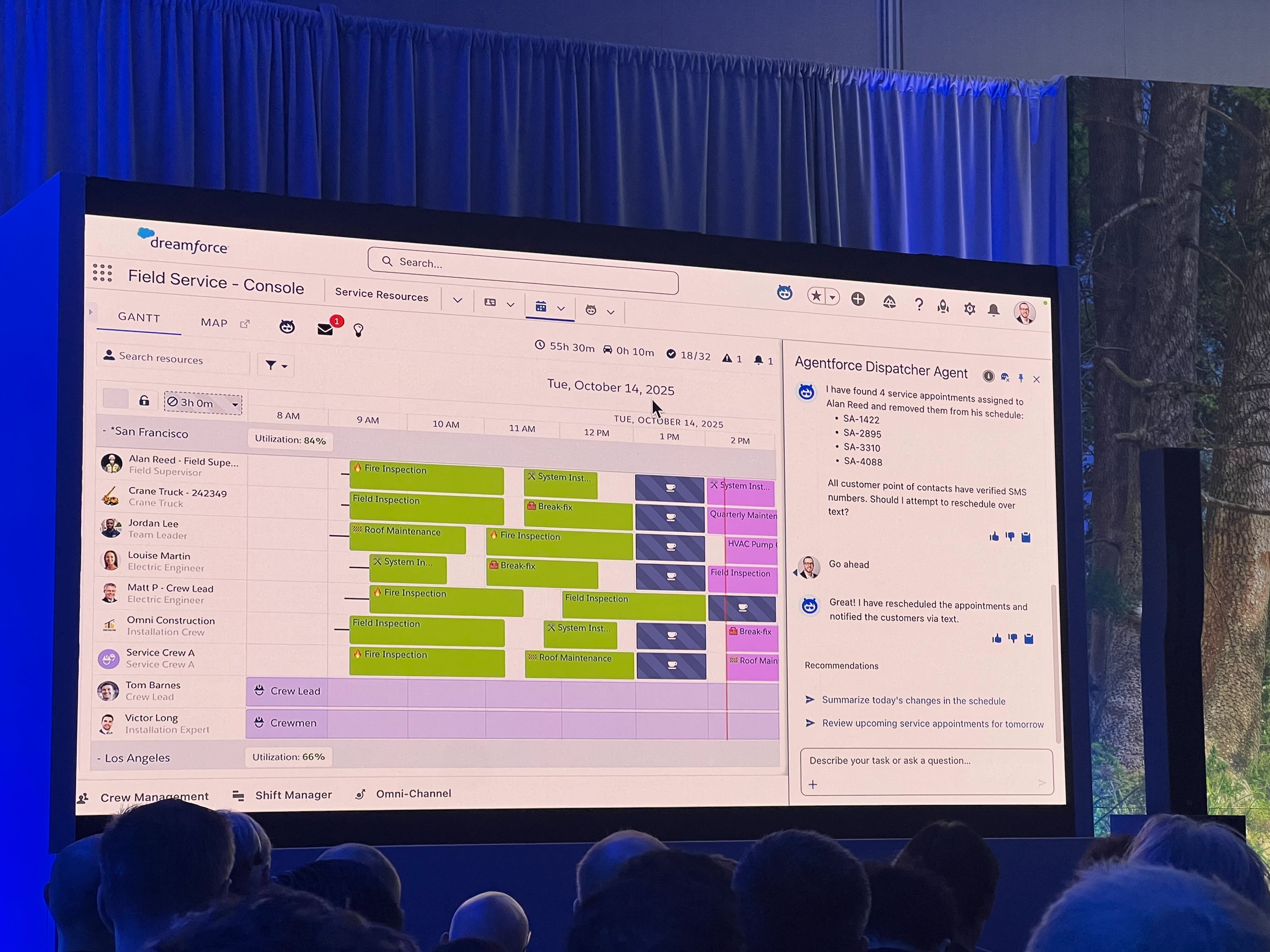 また、作業の割り当てにおいては派遣先の顧客との日程調整も重要なタスクですが、ここもAgentforceで自動化が可能になります。Agentforceが顧客の希望するチャネルで日程調整を自動的に行えるようです。デモではチャットでのやり取りでしたが電話でのやり取りも可能ということなんでしょうかね。これが実現できると確かにかなり効率的になりますね!