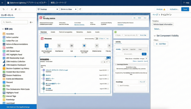 タイムラインは、イベントと活動を時系列に並べて「この車に何があったか」を一目で追える形にします。Salesforce Automotive Cloud では、Vehicle レコードページに Timeline を追加する手順が公式に提供されています。