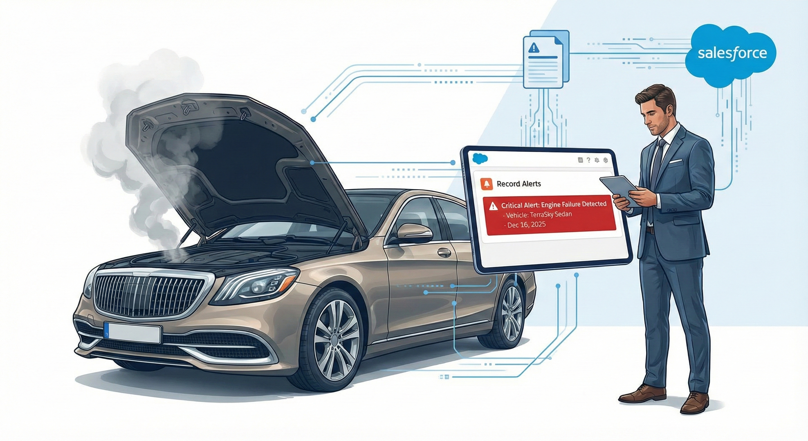 Record Alerts は「今すぐ対応が必要/近いうちに注意すべき」を画面上に通知として出す仕組みです。Salesforce Automotive Cloud では、外部のテレマティクスやナビゲーションシステムからのアラート表示も想定した説明があります。