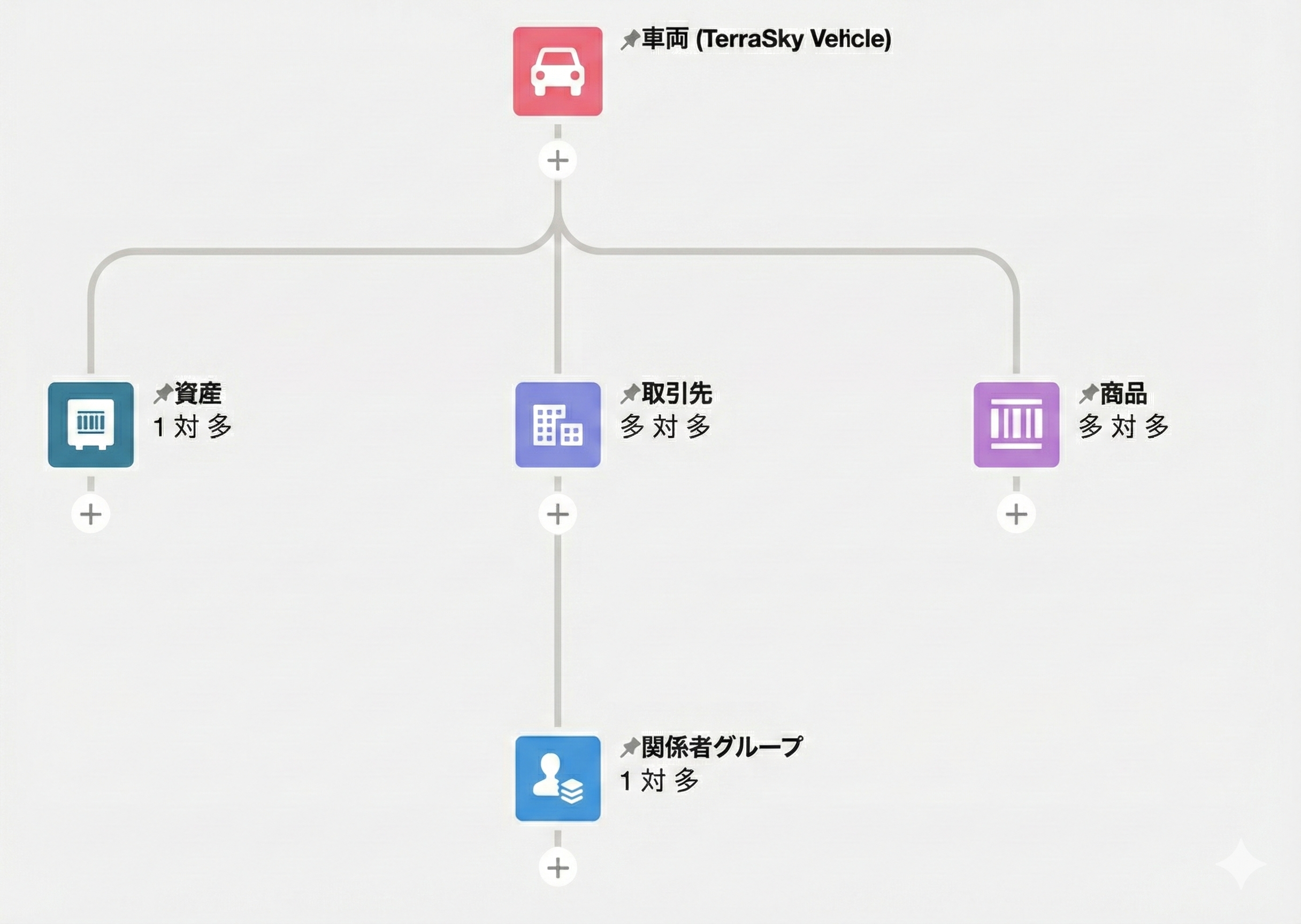 ・車両(Vehicle) → 納入商品(Asset)(主従関係)