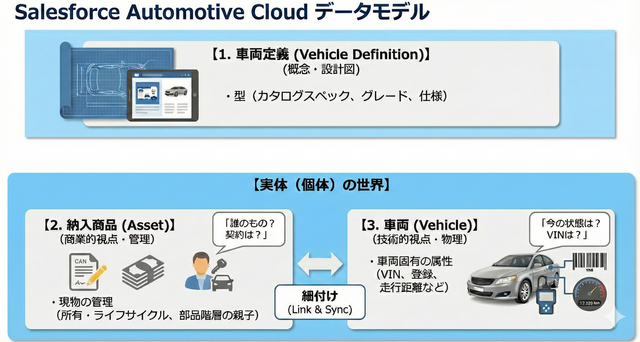 Trailhead では、Salesforce Automotive Cloud における Asset と Vehicle の関係を、非常に分かりやすく整理しています。