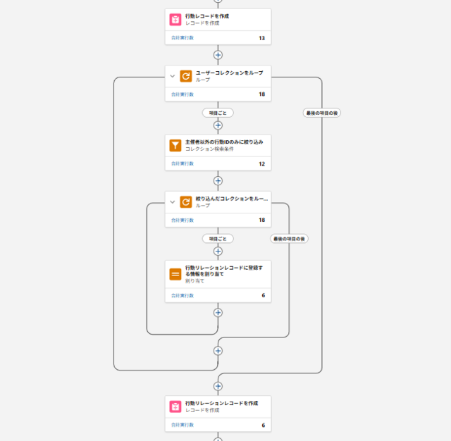 作成した行動レコードのIDを使い、招集者以外の参加者に対してループ処理を行い、行動リレーションレコード作成用のリストを作成します。