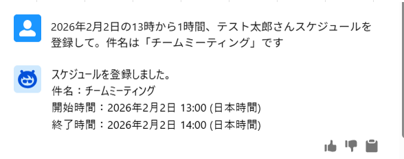 登録したいスケジュール内容をチャット形式で依頼することで、下記の通り簡単にスケジュール登録ができます。
