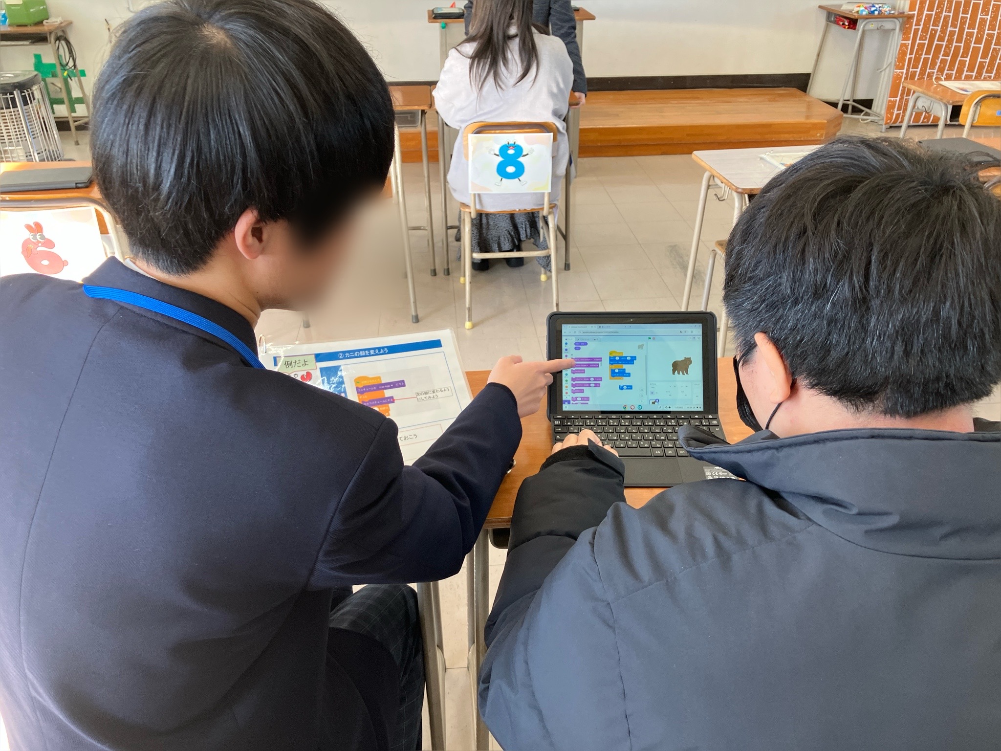 また昨年は、テラスカイ社員が体験ブース全体の講師を務め、生徒たちにはScratchの操作を子どもたちに教える役割をお願いしていました。しかし、「どう教えたら楽しんでもらえるか」「どうしたら全体が盛り上がるか」など体験ブース全体をより良くしていこうとする姿勢を見て、「全面的に任せられる!」と確信。昨年は徐々に任せる範囲を広げましたが、今年は最初から体験ブースの運営全体をお任せすることにしました。