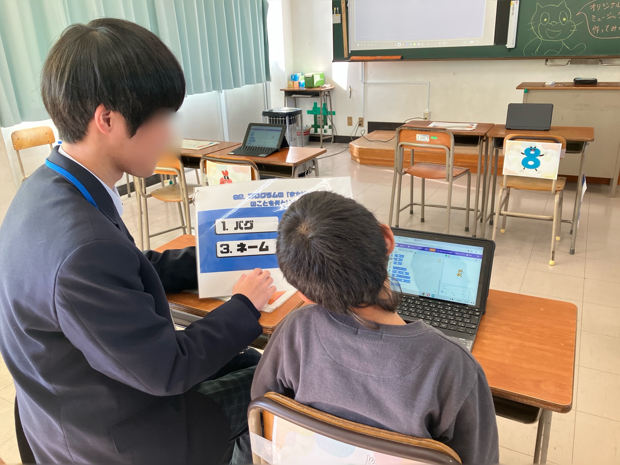 体験前には、プログラミングにまつわるクイズを用意するなど、ただ体験して終わるだけでなく、「学び」も取り入れているところに、生徒たちの素晴らしい工夫を感じました。