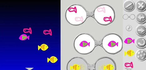 2つ目の体験ブースは、ぬりえ水族館です。Viscuitというアプリを使って画面上に好きな絵を描き、その絵の動き方を「メガネ」という部品を使ってコンピュータに教える、ユニークで直感的なプログラミング体験ができます。