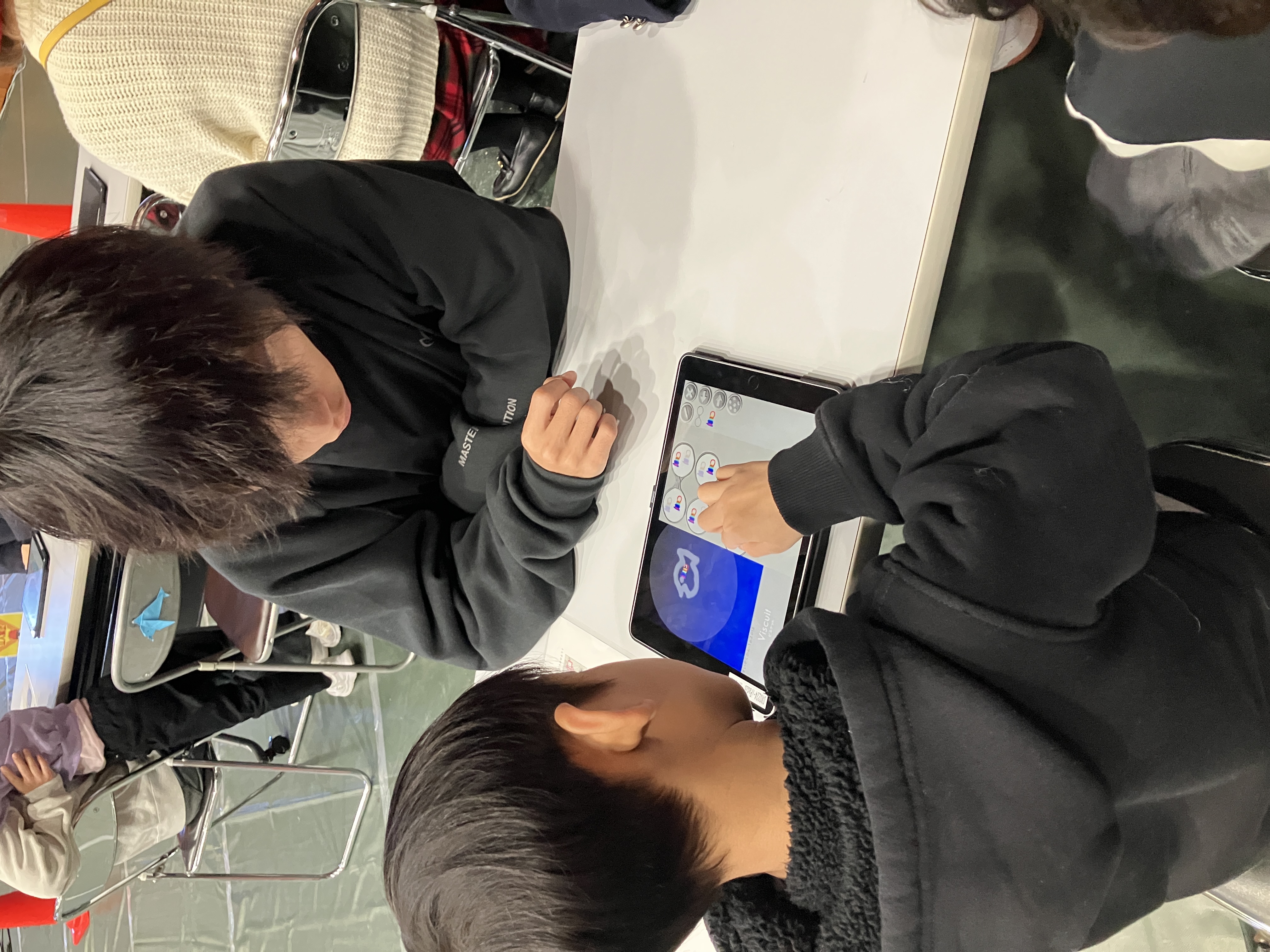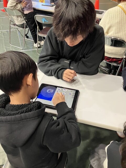 体験に参加した子どもたちは、タブレットで自分だけの好きな魚や海の生き物の絵を描きあげます。次に、その絵をどう動かしたいか想像を膨らませながら、メガネ機能を使ってプログラミングに挑戦。それぞれが試行錯誤を繰り返し、ユニークで面白い動きをどんどんプログラミングで実現していきました。