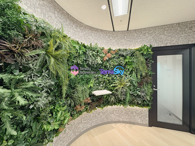 エントランスはテラスカイ東京本社と同じでグリーンウォールでお出迎え。他のオフィスと異なるのは、エントランスの壁面に盛岡城の総石垣造りをイメージしたデザインが施されている点です。訪れる人々を温かく迎え、盛岡の悠久の歴史と自然の力強さを同時に感じていただけるかと思います。