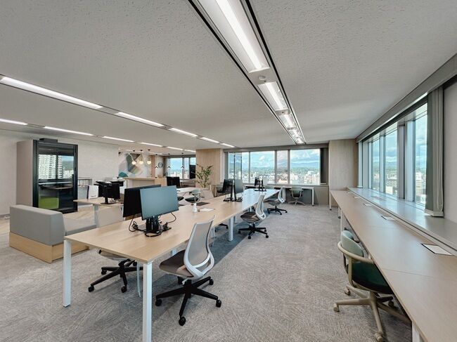 オフィス内は、眺めの良い大きな窓が特徴的で、盛岡の街並みと岩手山が一望できます。オフィス内の壁も岩手山と御所湖をイメージした自然豊かなデザインになっています。全体的に明るい色を基調としたオフィスで、自然のぬくもりに包まれ、心地よく仕事に集中できる空間となりました。