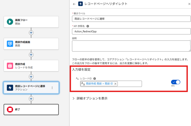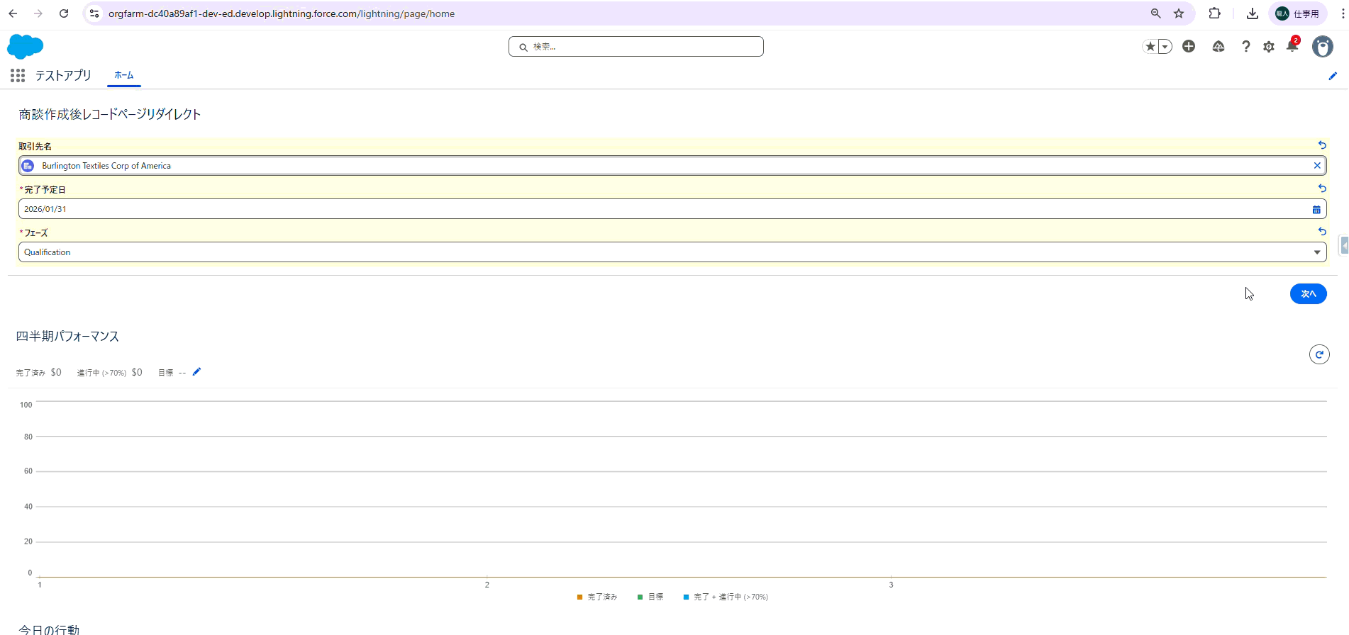商談レコードを作成した後、標準の完了画面を出さずに、作成された商談レコードのページへ直接遷移しています。