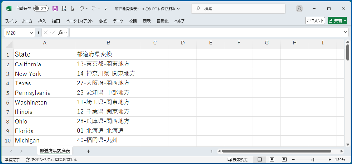 今回は、以下のような構成のExcelファイル(所在地変換表.xlsx)を用意しました。