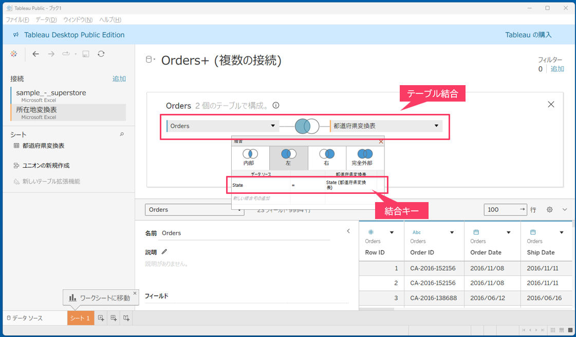 「Orders」と「都道府県変換表」を繋ぎます。